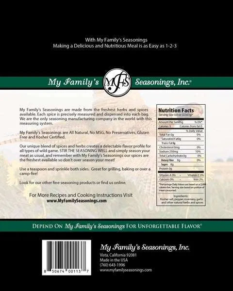 One package of 3.6 oz My Family's Wild Game Poultry covers about 25 lbs. of fowl meat.